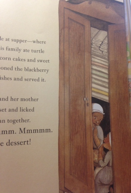 Very interesting analysis, Edi. Excellent reminder to all readers to read the illustrations along with the text. I’m not sure, however, if there isn’t a rush to judgement (and apology by the author) on this book. Thinking about how a purpose, goal, and tactic of those involved in the crime of slavery was to dehumanize the human beings they kidnaped, worked unmercifully, punished in brutal ways, and bought and sold in markets, I can’t help but cheer each time I see/read of an enslaved human being rising above the power of these acts. A little girl smiling in the presence of her mother is an important image. And, as the blackberry picking panel and the closet scene underlines, the brutality of slavery these victims suffered did not crush their humanity. As black folklore truth puts it, this mother and this child, “had one face for the master and one face that is mine.”
