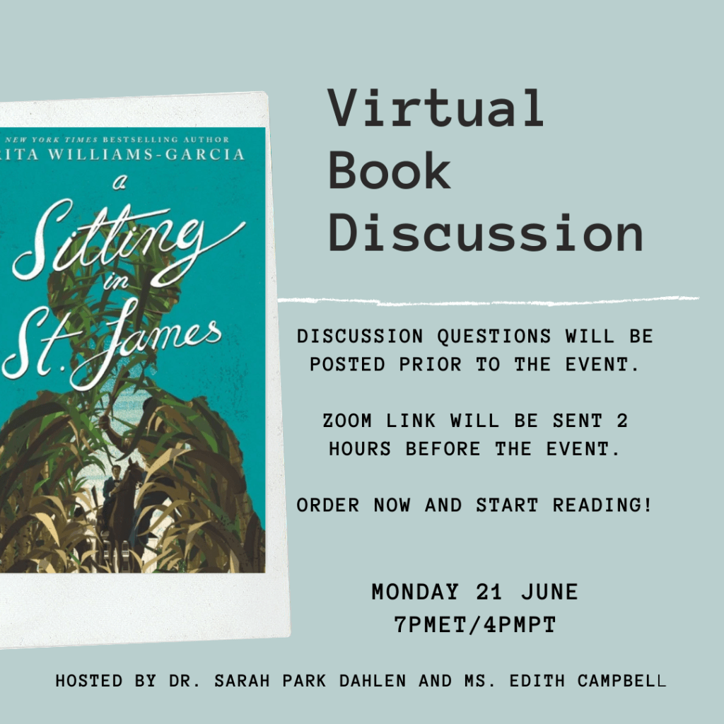 Dr. Sarah Park Dahlen and I decided to hold another online book discussion! Our discussions are like book group meetings, so order your copy of the book, get you tea and cookies ready and join us as we discuss A Sitting at St. James by Rita Williams-Garcia (HarperCollins, 2021).