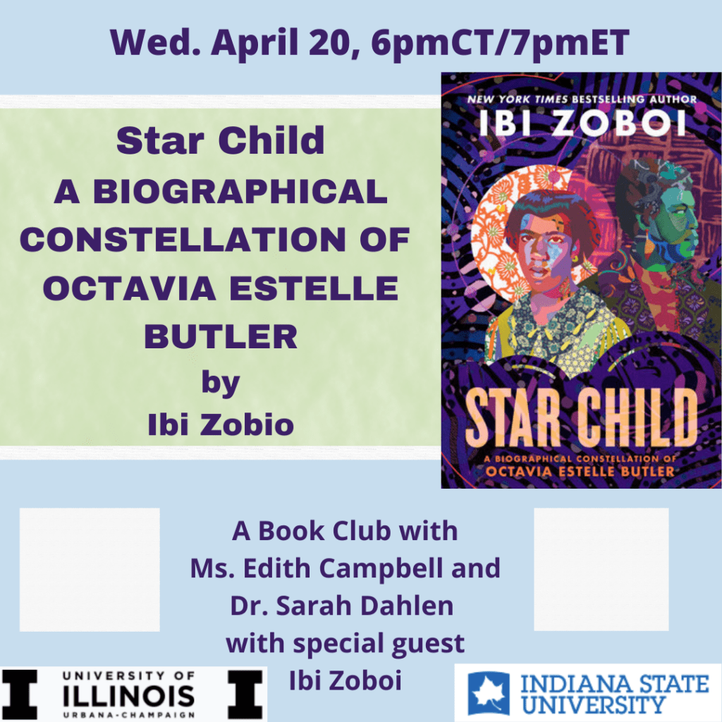 The next Book Club with Ms. Campbell and Dr. Dahlen is next Wednesday 20 April at 7pm ET/6pmCT. We’re discussing Ibi Zoboi’s Star Child: A Biographical Constellation of Octavia Estelle Butler. I’ll come back and add the registration link to this post as soon as I have it, will also share it on the socials. If you prefer to email and have me send it to you, that’ll work! crazyquilts AT hotmail dot com