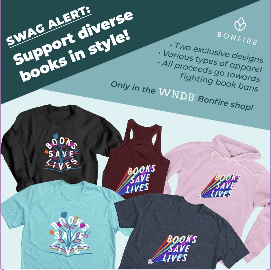We Need Diverse Book’s new campaign, #BooksSaveLives, is designed to combat book bans and censorship. You can join the fight by buying swag, posting photos or videos with #BooksSaveLives, and/or attending school board or library board meetings. Funds generated during the campaign will be used in 3 ways.