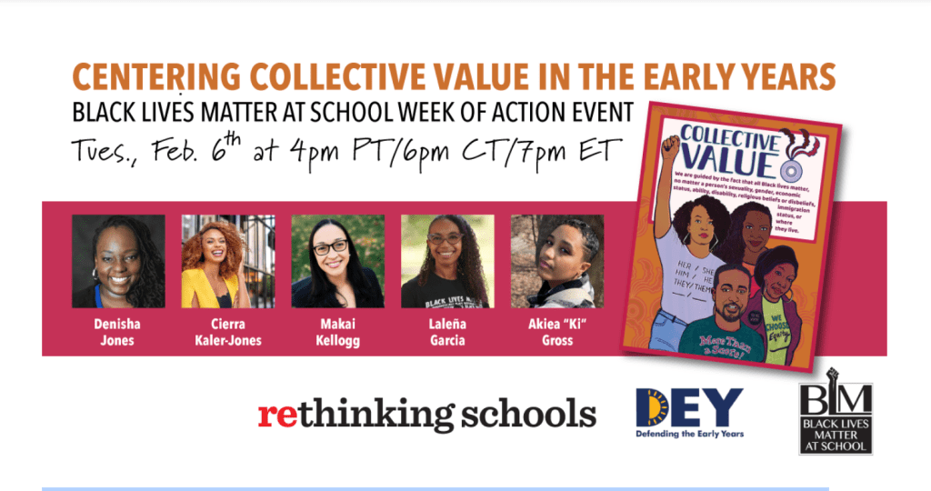 Join Rethinking Schools, Defending the Early Years, and Black Lives Matter at School for a conversation on Centering Collective Value in the Early Years. This webinar event celebrates Black Lives Matter at School Week of Action.