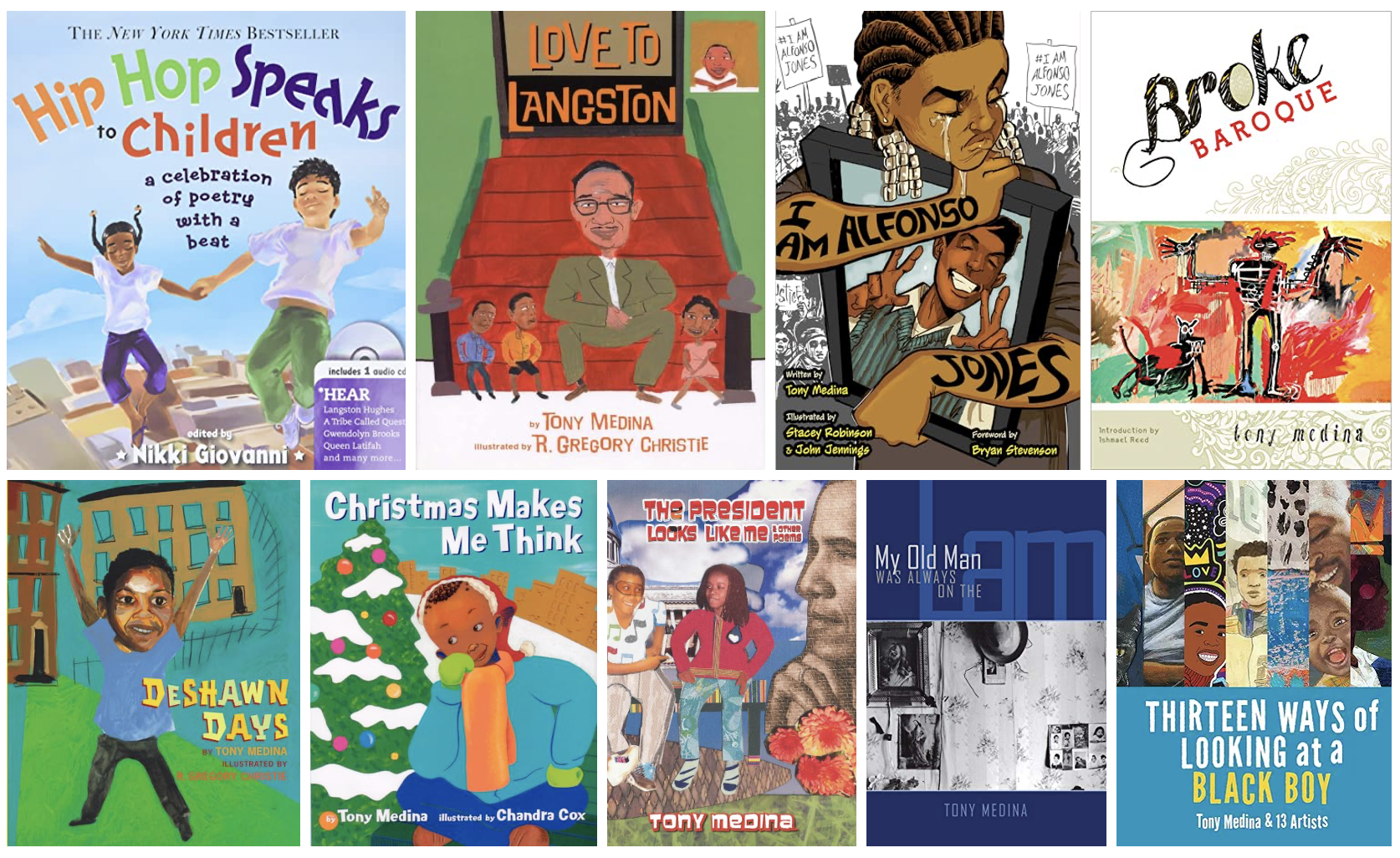 Tony Medina is the author/editor of seventeen books for adults and young readers.Medina is affiliated with Behind the Book, a non-profit literacy organization based in New York City; A Cultural Exchange, a non-profit literacy organization based in Cleveland, Ohio; and Say it Loud Readers and Writers, a youth and adult literary arts organization based in Little Rock, Arkansas.In 2013, Medina was nominated for a Pushcart Prize in poetry, received both the Langston Hughes Society Award and the first African Voices Literary Award, as well as becoming a finalist for the Julie Suk Award for Best Poetry Book from an Independent Press for his latest collection, Broke Baroque (2Leaf Press).