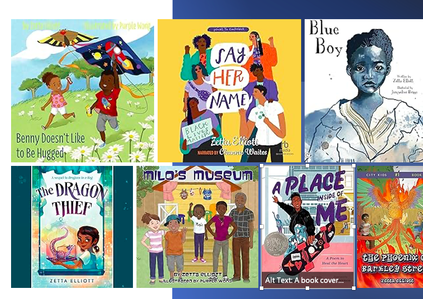 Zetta Elliott was born and raised in Canada. She moved to the United States to attend college, and has remained in this country. Zetta earned a PhD in American Studies from NYU. She has published plays, novellas and poems, and she’s also has taught. Her picture book, Bird, won the Honor Award in Lee & Low Books’ New Voices Contest and the Paterson Prize for Books for Young Readers. A Place Inside Me, A Poem to Heal the Heart was named an ALA Notable Book and a Notable Poetry Book by the National Council of Teachers of English; it won a 2021 Skipping Stones Honor Award and Noa Denmon won the Caldecott Honor Award for illustrations. Zetta delivered the Zena Sutherland Lecture in May 2023. She has published over 40 books for children, teens, and adults.